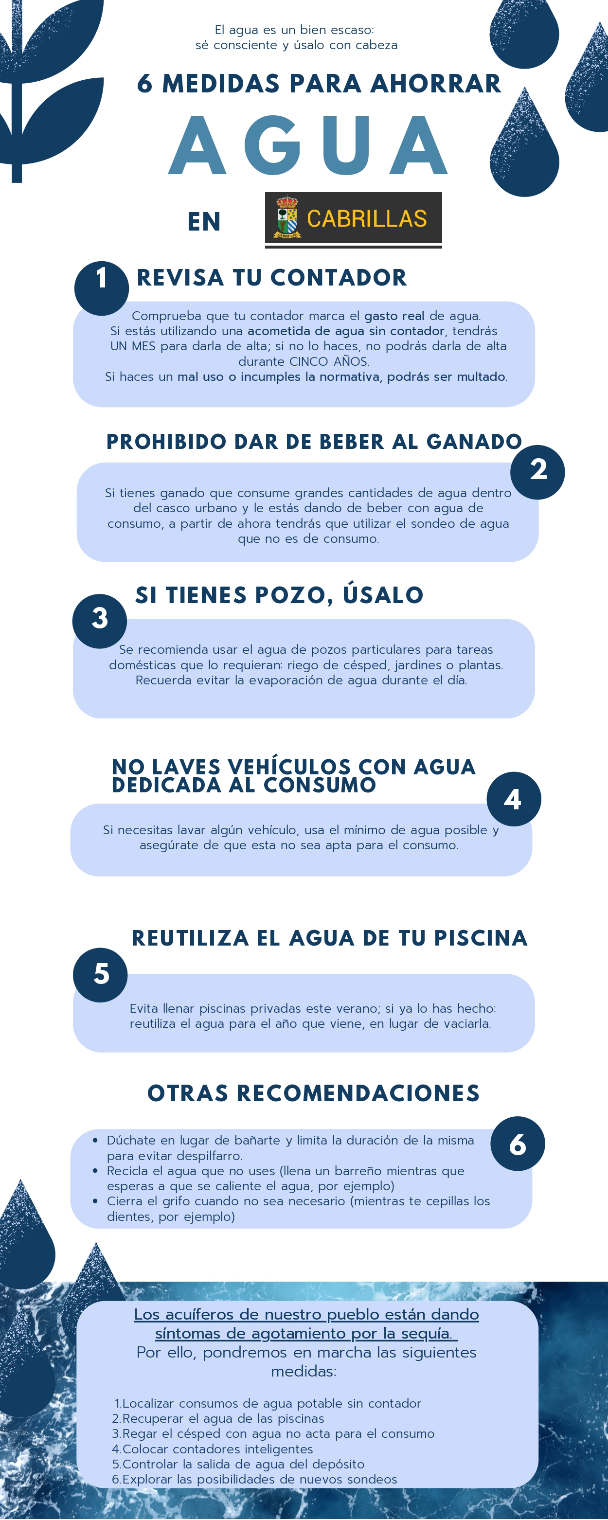 Aquí te indicamos unas medidas para ahorrarla: revisar tu contador, no usarlo para el ganado, usar preferentemente pozos, no lavar los vehículos y reutilizar el agua de las piscinas, entre otras tantas medidas. Síguelas y ayuda al medio ambiente.