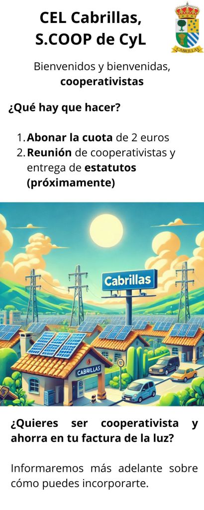 Cabrillas es un pueblo comprometido con el medio ambiente y quiere que eso se refleje en la factura de la luz, por lo que se ha creado una cooperativa. Para formar parte de ella, solo tienes que abonar 2 euros… explicaremos todo y responderemos a vuestras dudas en una reunión.