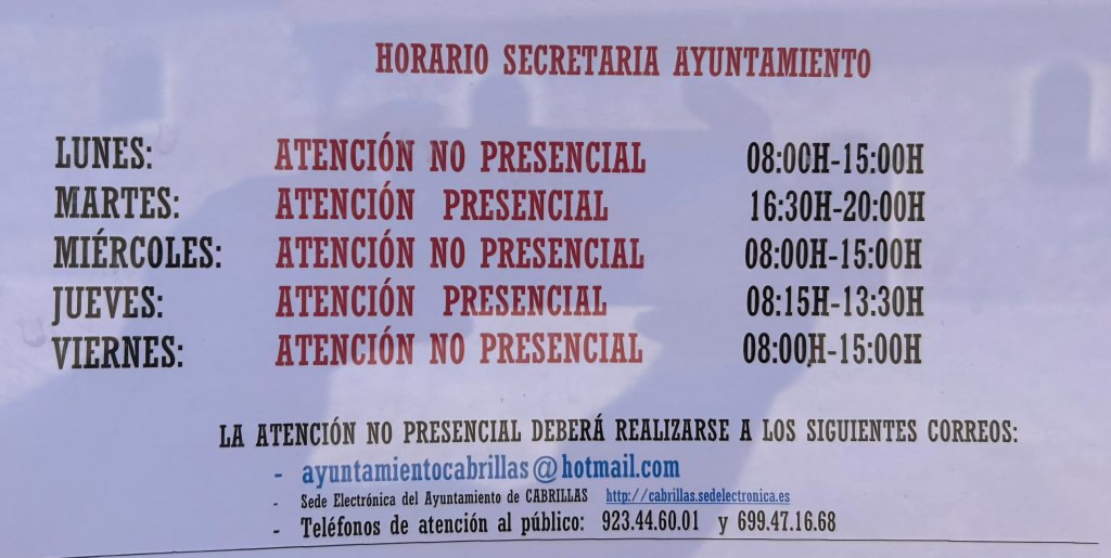 - Atención presencial: martes 16:30h a 20h y jueves 8:15h a 13:30h.